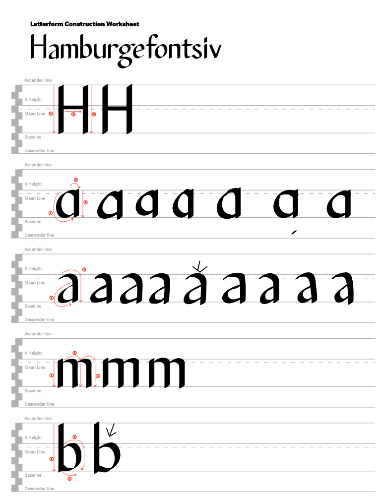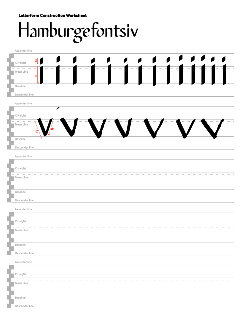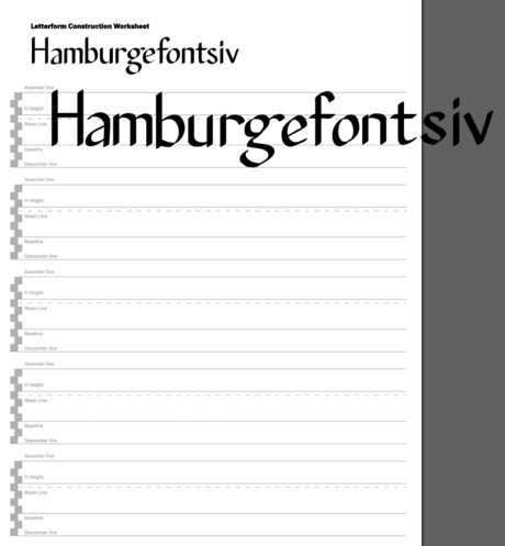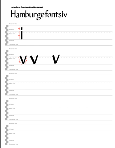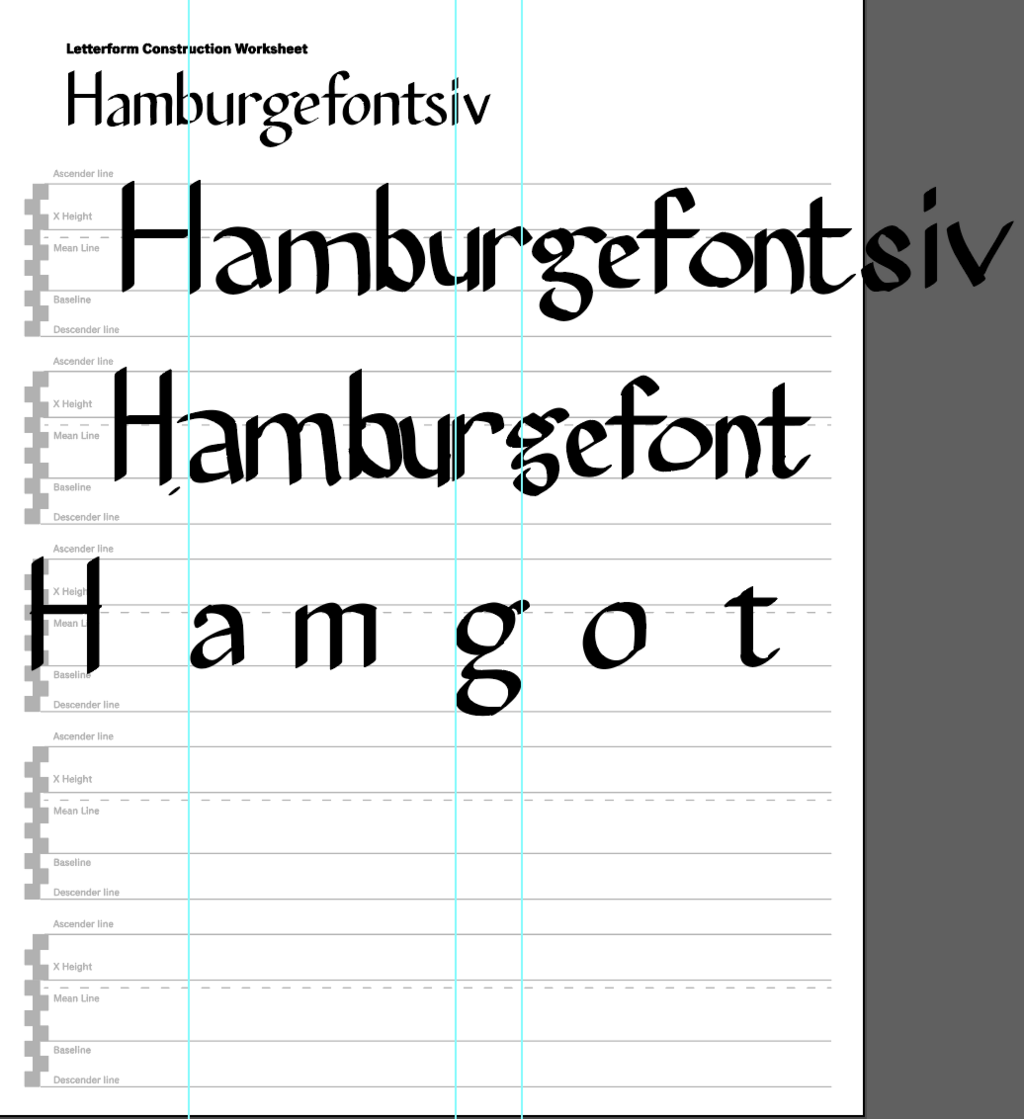 In the first draft of the letter form construction worksheet, I practiced letterforming in Adobe Illustrator. Because this is my first draft, not all the letters came out well enough to be used in the final.
